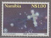 一方、北部の方には、アフリカ最大の滉漾たる鹹湖エトーシャがあるので、この辺りで人々は霄漢を仰望し夥多の星を擅に観察するのでしょう。南十字星の事ですが、極めて酷似したforgery(フォーゲリー)が存在する。偽南十字星は帆座(Vela)のκ、δ、および、りゅうこつ座(Carina)のη、εの四星から成り立っていて、十字もgenuineより少し大きいだけに見誤りやすい。甄別法としては、弧矢八星の一部であるウェズン、アルドラ、アダラからなる三角形の内角を四分の一に分割した線を引いていくと、近い方がforgery cross、遠い方が南十字星(genuine cross)である。昔の人は、この三角形を鞍掛星と呼んでいた。(鞍掛星はノアのアルゴ船の艫のξ星アスミディスケの西に鎮座している。)別のインディケーターとして、帆掛け星を用いる。Corvusのε‐ミンカルから、α‐アルキバを南に延長していき、今は亡き伝説の星官「器府」を越えると、倏忽として、行路を対称軸に二つの十字星が現れ、東側がgenuineで、西側がforgeryである。この切手では、アクルックス、ベクルックス側に暗翳の闇があるので劃然とした差で識別できる。これは天文学では、コールサックと呼ばれる暗黒星雲である。左下コーナーにある二つの星は、左隅がトリマン、右がアゲナと呼ばれるもので、これらの星はケンタウルス座になる。(ハダルとかβーケンタウリとか呼ばれているのは、アゲナの異称である。)江戸時代に天竺徳兵衛が南海の夜空を領する大クロスを語っているが、実はこれは偽十字星の事である。嚆矢としては、古代バビロニアの時代に占星術師がエリドウの星という神秘的な星がある事を伝承しているが、地軸の歳差運動を逆算で戻して天球を凝視した場合、北緯30度のバビロニアにおいて、十字星が消えた跡にもうひとつの十字星が約1時間以上に亘って瞬くことが解り相好を崩す。。エリドウの星はαとβがカンデラ数値の高い透徹した白光に対してγは鮮やかなオレンジ色で、δとαの間にポツンと余分のεという橙色の鋲を打っているので正真正銘の南十字星(genuine